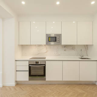 Cocina lineal: Las lineales son aquellas que disponen los módulos de gabinetes y área trabajo en una sola pared. Este diseño es el más adecuado cuando el espacio en rectangular o angosto.